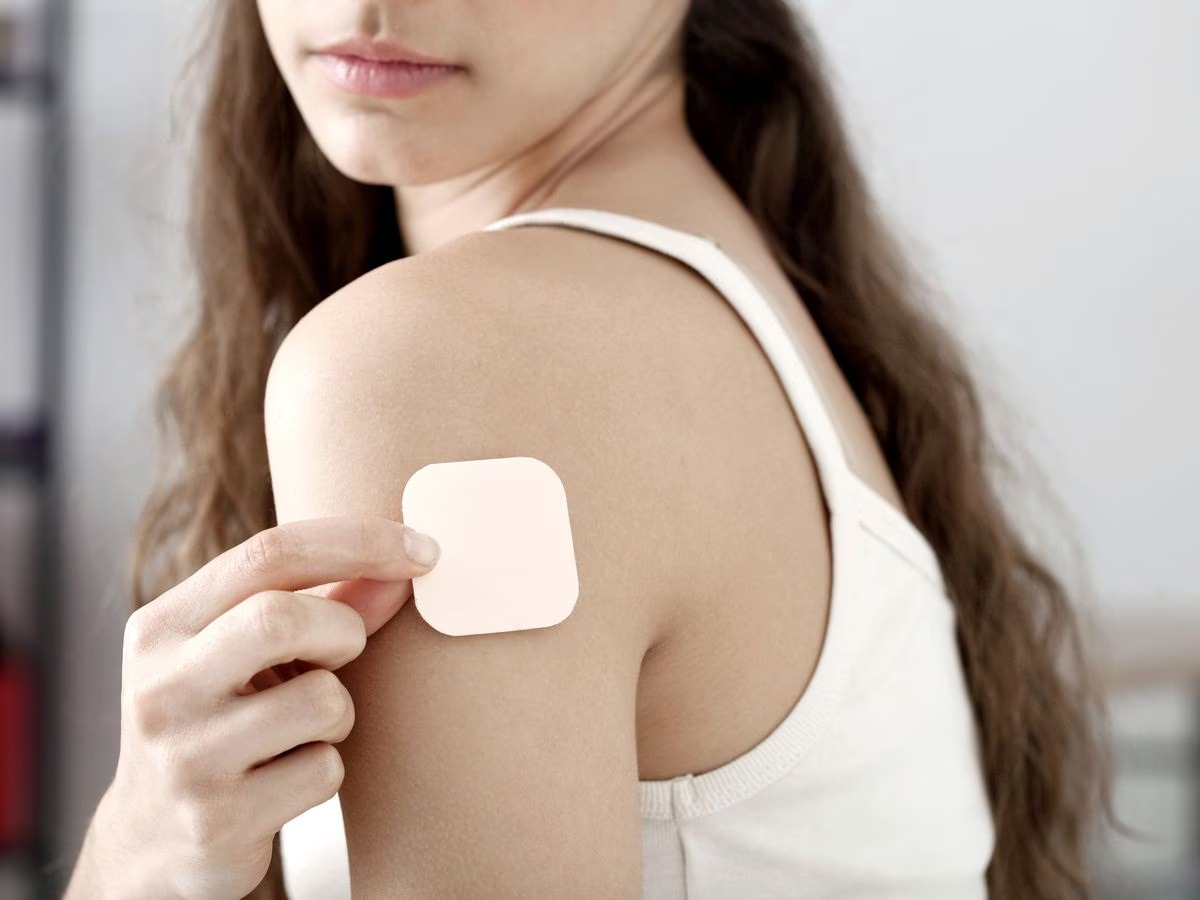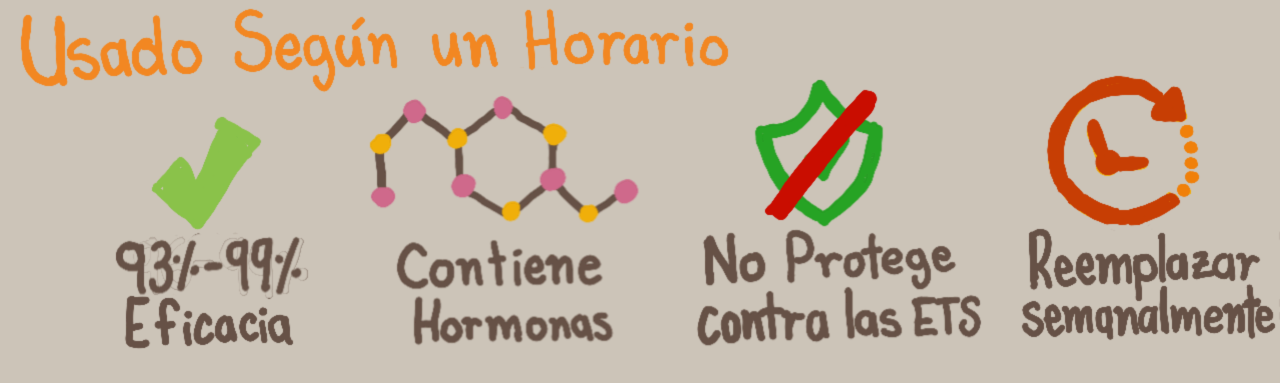 Es un parche adhesivo, fino y pequeño que se coloca sobre la piel. Libera de forma continua las hormonas estrógeno y progestina a través de la piel hacia el torrente sanguíneo.