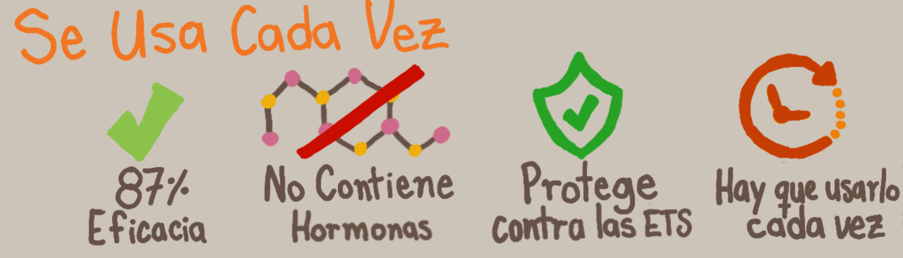 El condón actúa como una barrera física que retiene el semen eyaculado, impidiendo que entre en la vagina, el ano o la boca de la pareja. Al ser una barrera, es el único método anticonceptivo que también ofrece una protección efectiva contra la mayoría de las infecciones de transmisión sexual (ITS), como el VIH, la gonorrea, la clamidia y el herpes.